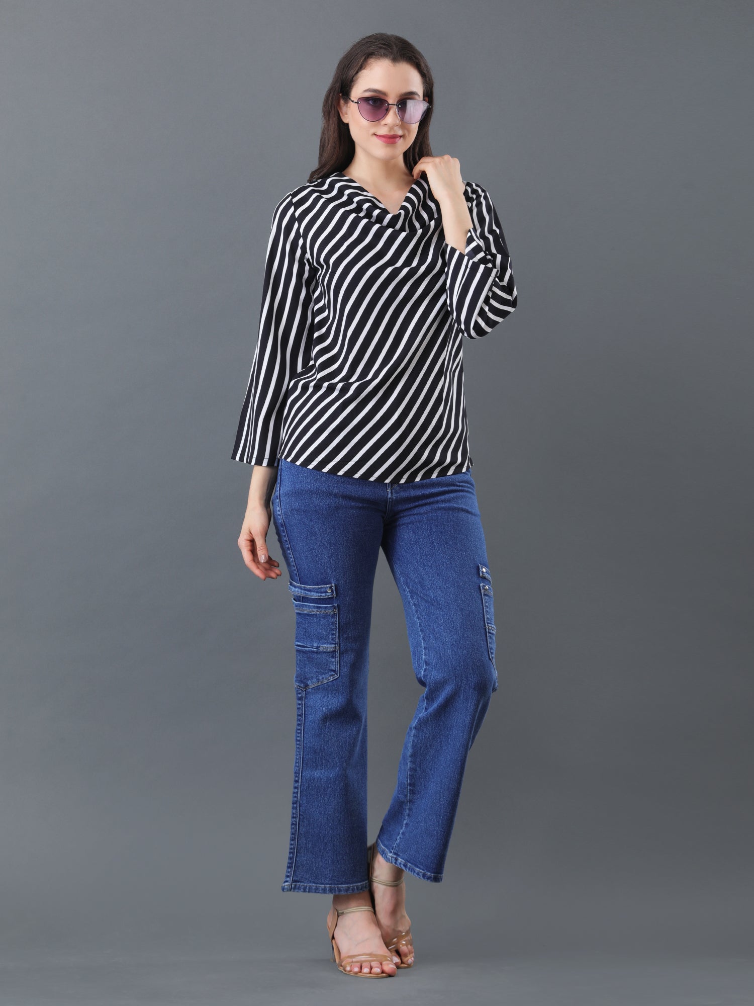 Enhance your style with this chic black & white striped Cowl neck top for women, crafted for comfort and eye-catching appeal. Featuring a contemporary draped neckline and practical 3/4 sleeves, this stylish western wear blouse seamlessly blends modern fashion with ease of wear. The bold stripes offer a timeless look, perfect for both office attire and casual day outs. Pair effortlessly with jeans, trousers, or skirts for a versatile outfit in every season