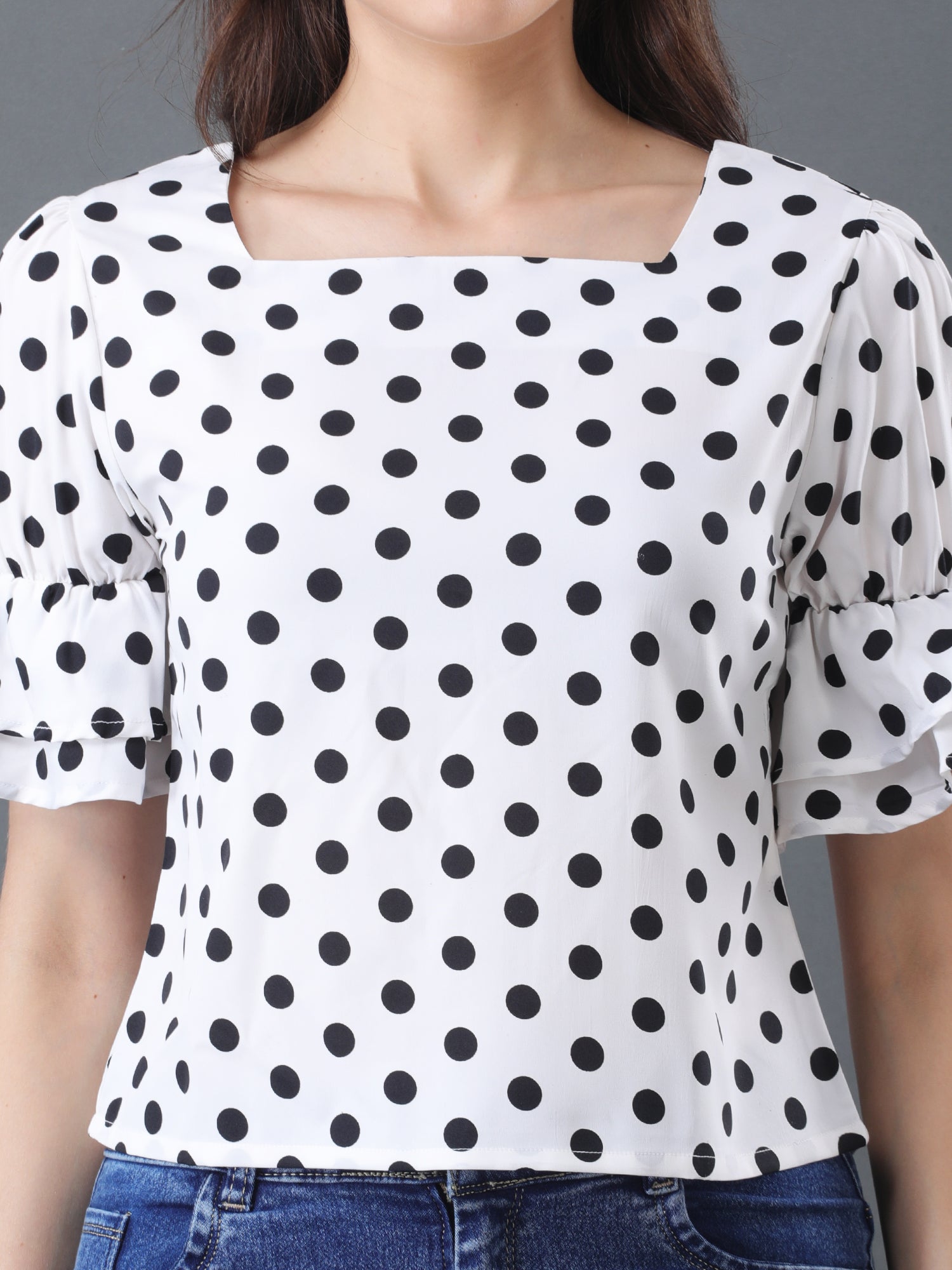 Upgrade your wardrobe with this White with Black dotted ruffle sleeve top for women, designed for style and comfort. Perfect for casual outings, office wear, and weekend getaways, this statement piece features eye-catching layered puff sleeves and a flattering round neck. Pair with jeans, trousers, or skirts for a chic and contemporary look throughout the seasons. Made from soft, breathable fabric ideal for Indian weather, this blouse brings a vibrant touch to everyday fashion.