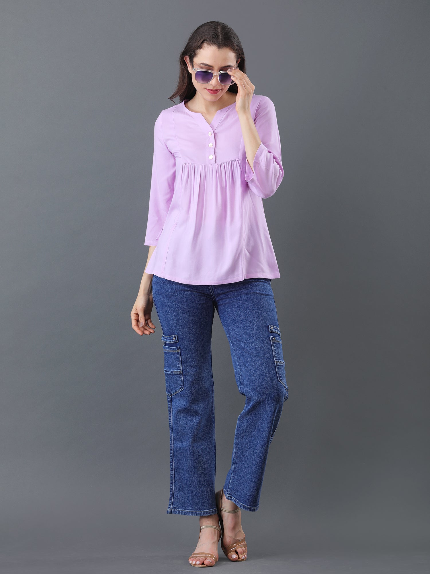 Freshen up your wardrobe with this lavender pleated flare top, designed for effortless everyday style. Crafted in soft rayon fabric, it feels light and comfortable against the skin. The V-neckline with delicate pleats along the yoke adds subtle texture, while the 3/4th sleeves keep it relaxed and wearable all day long. Perfect for casual outings, work, or get-togethers, this top pairs beautifully with jeans, skirts, or trousers for a chic and versatile look.