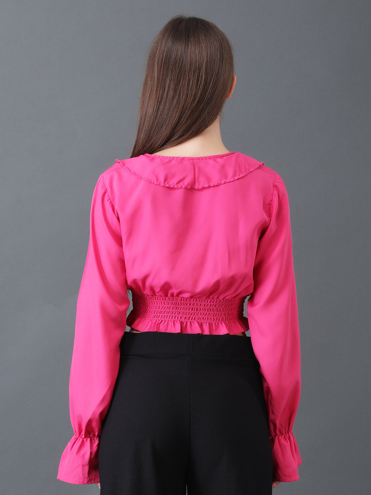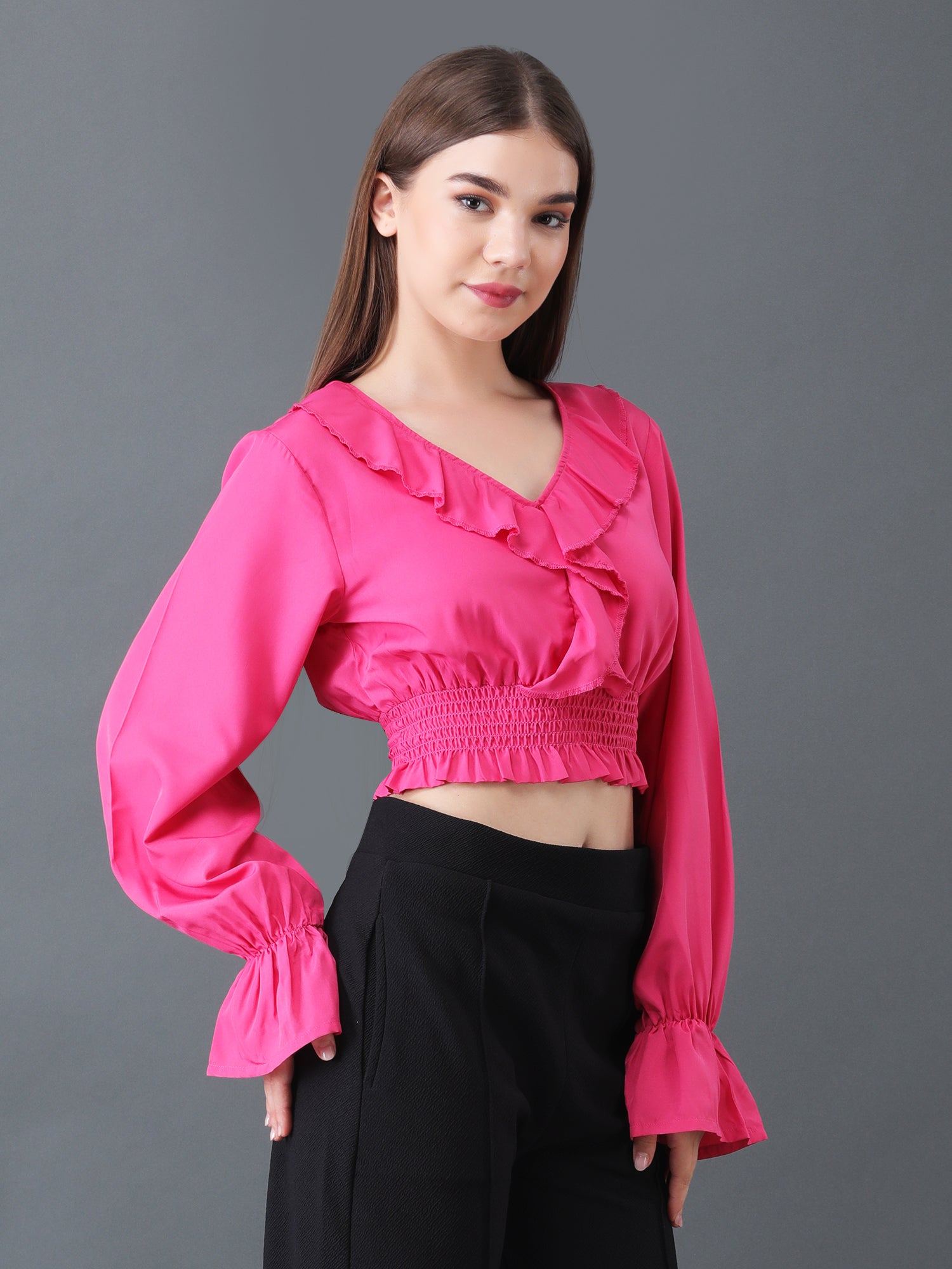 Elevate your style with this vibrant pink crop top featuring elegant ruffle detailing on the neckline and front. Designed with long, gathered sleeves and a flattering smocked waist, this top offers both comfort and a chic silhouette. The lightweight fabric and playful design make it perfect for pairing with high-waisted trousers or skirts for a trendy daytime or evening look