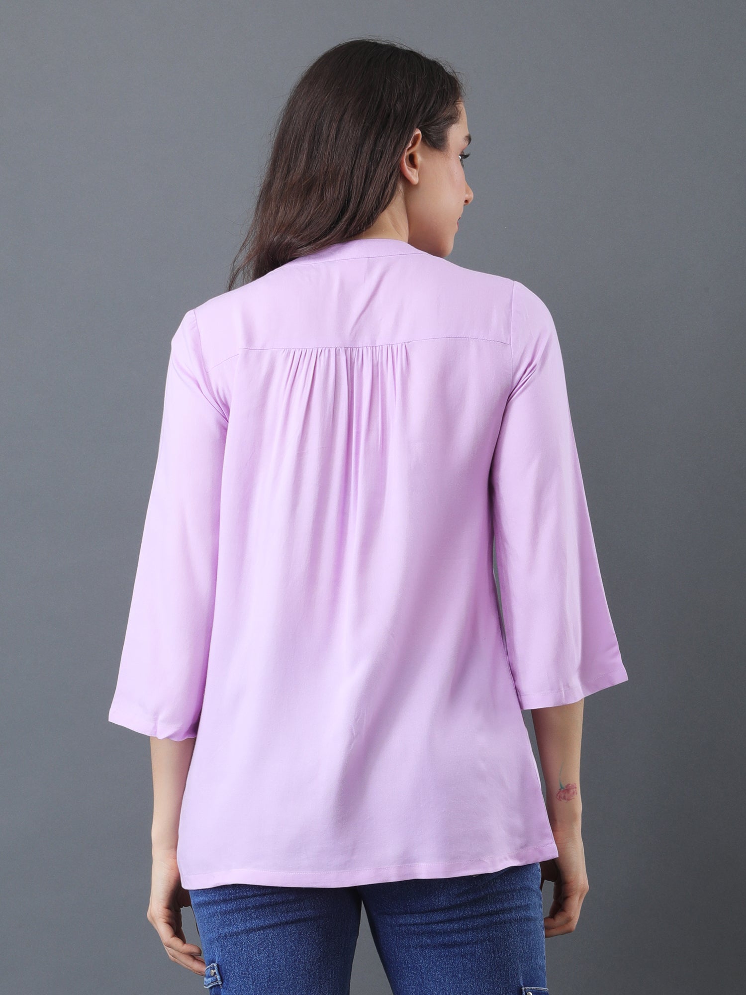 Freshen up your wardrobe with this lavender pleated flare top, designed for effortless everyday style. Crafted in soft rayon fabric, it feels light and comfortable against the skin. The V-neckline with delicate pleats along the yoke adds subtle texture, while the 3/4th sleeves keep it relaxed and wearable all day long. Perfect for casual outings, work, or get-togethers, this top pairs beautifully with jeans, skirts, or trousers for a chic and versatile look.