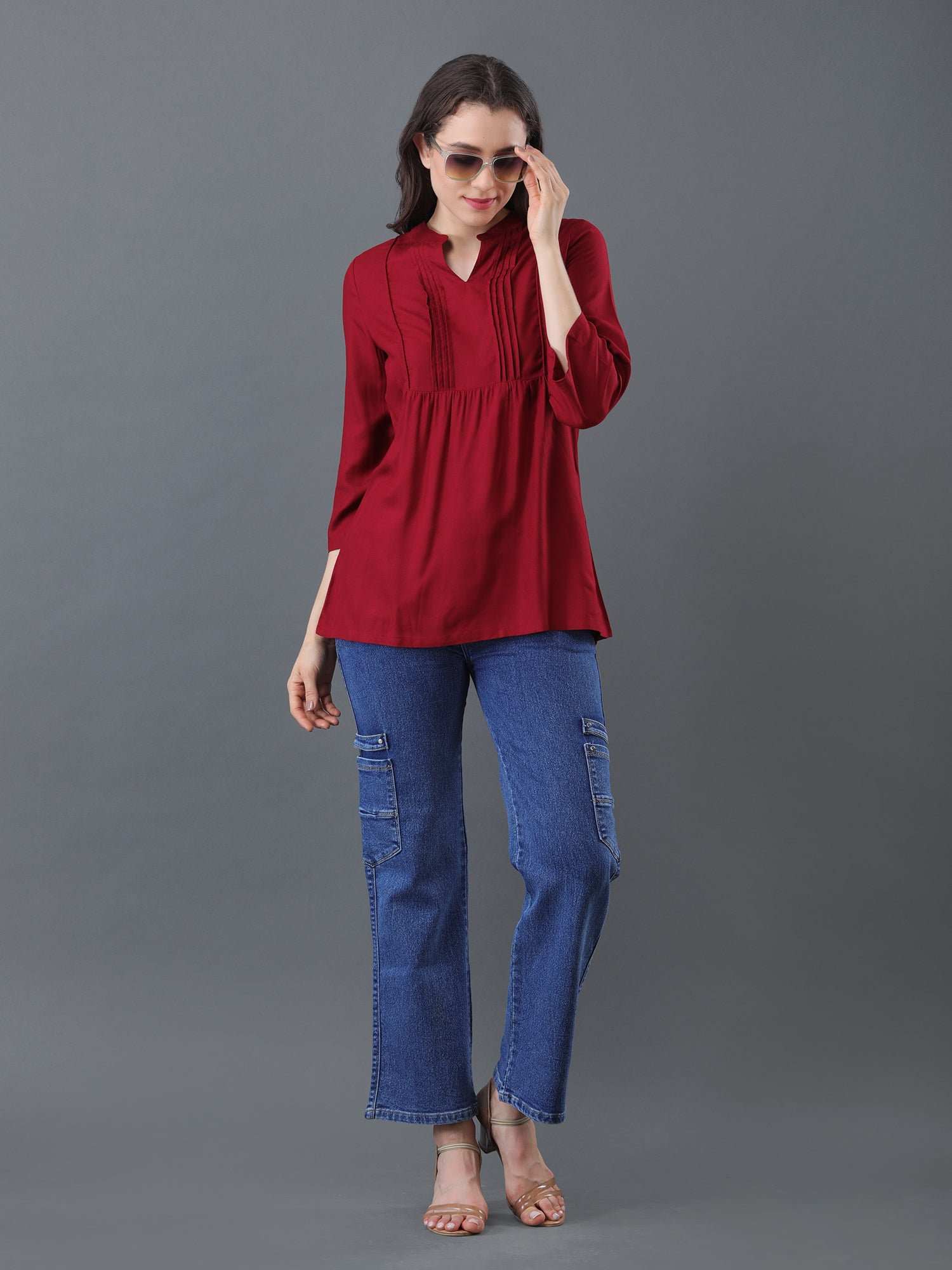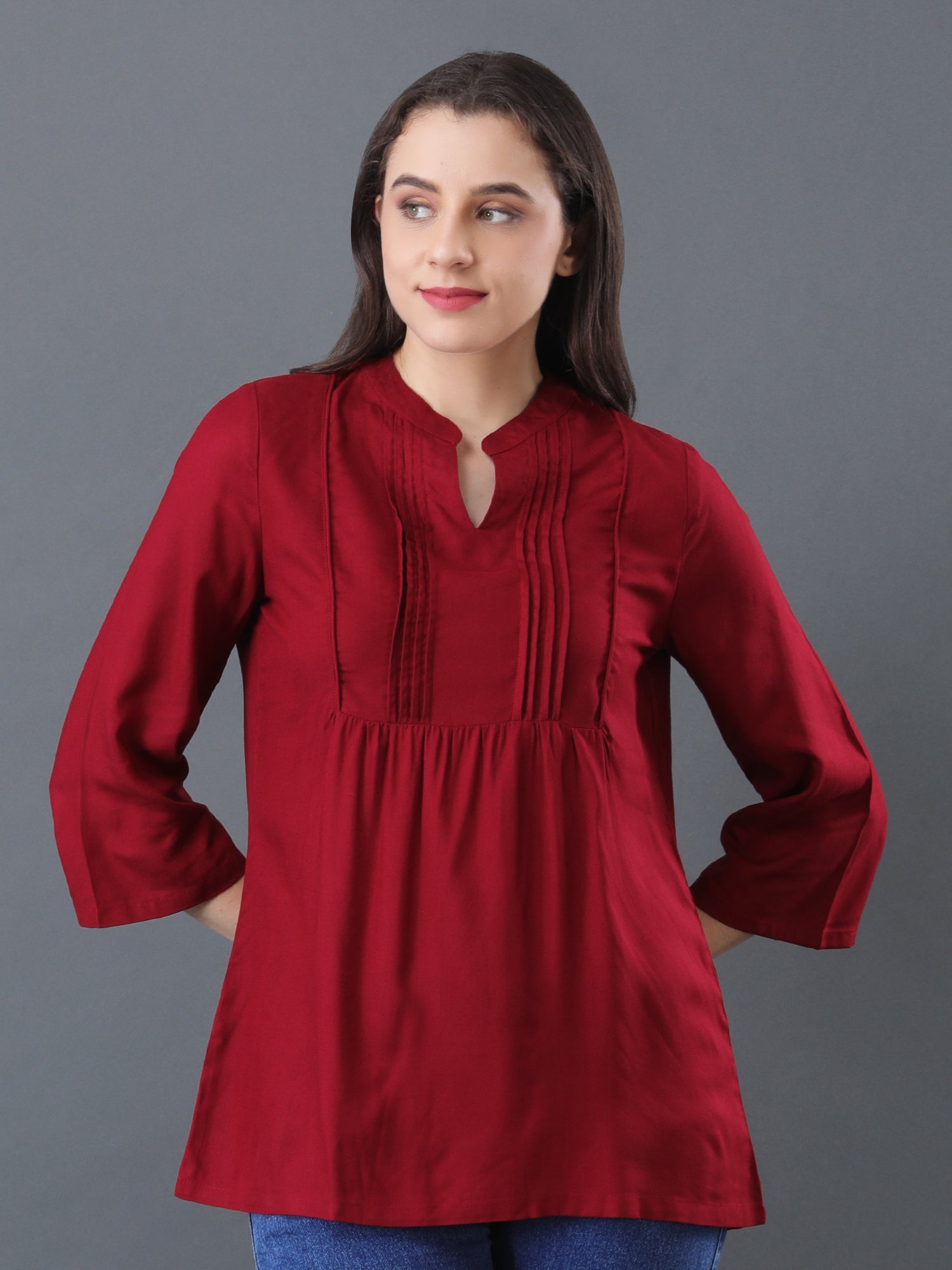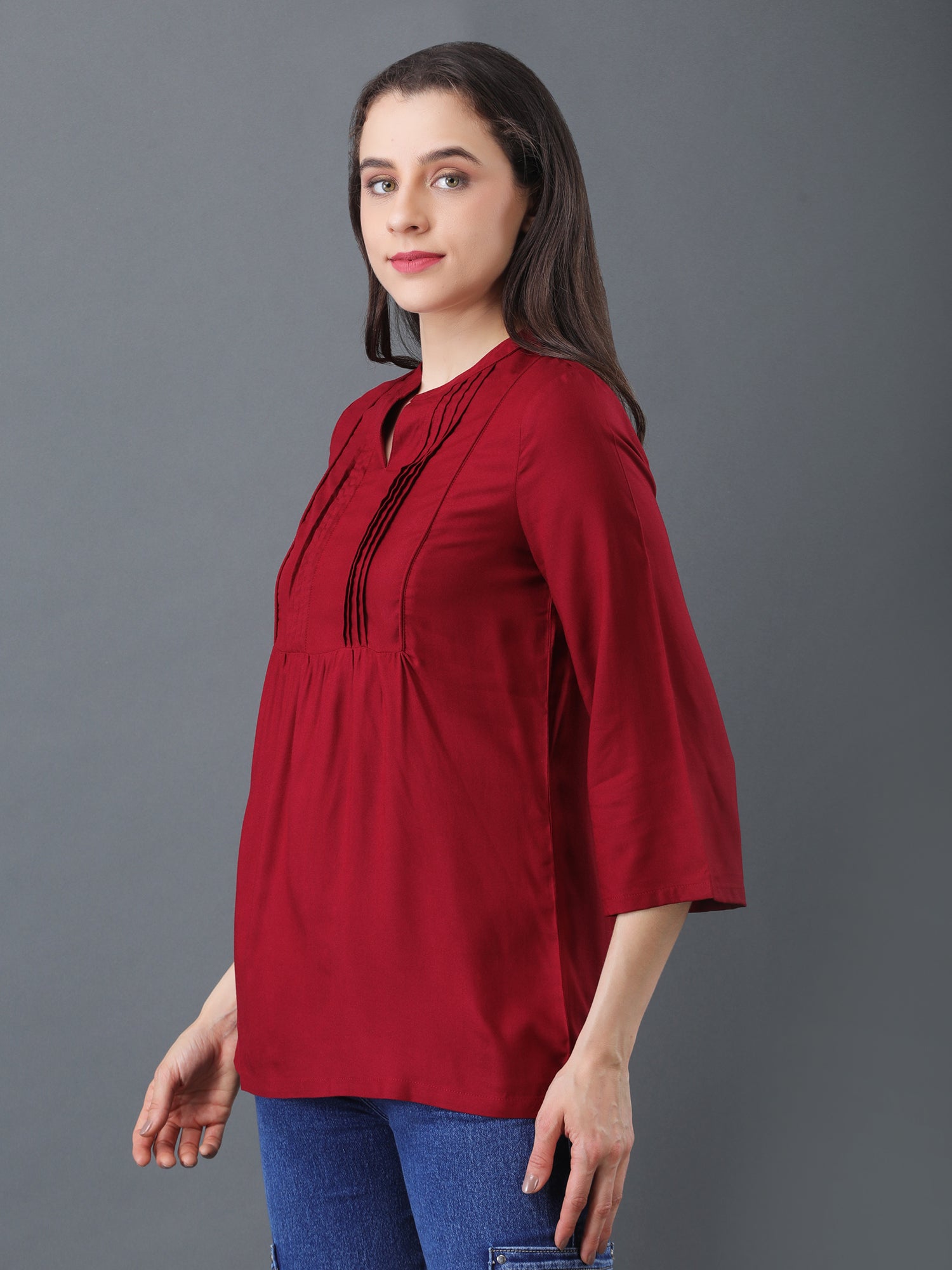 Refresh your wardrobe with this elegant maroon pintuck top for women, designed for modern comfort and timeless style. Featuring chic pintuck detailing on the front, a classic notched neckline, and practical 3/4 sleeves, this versatile tunic is perfect for casual outings, office wear, and everyday occasions. Made from soft, breathable fabric, it ensures lasting comfort and easy movement throughout your busy day.