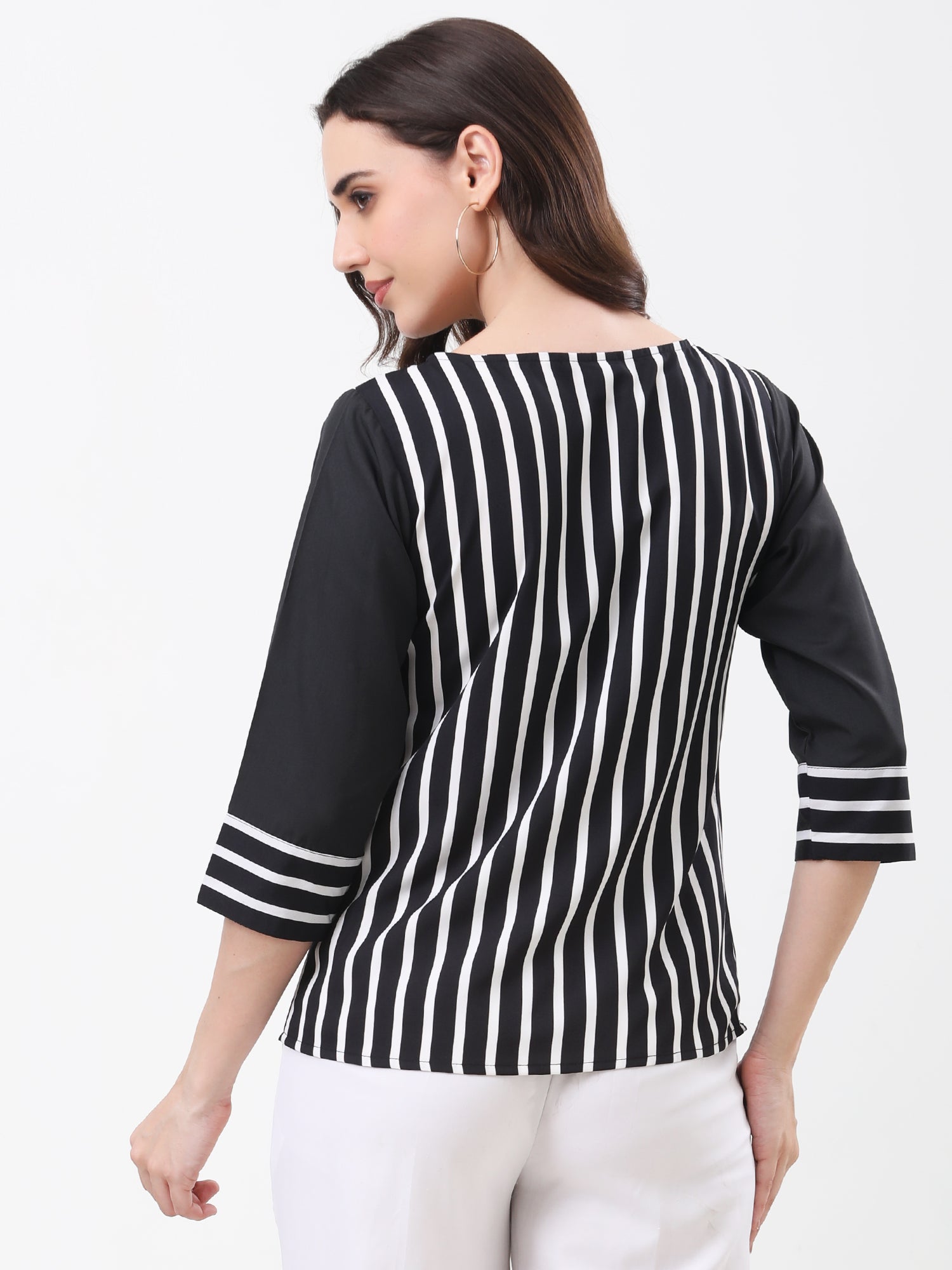 Women's Black and White Vertical Stripe 3/4 Solid Sleeve Top