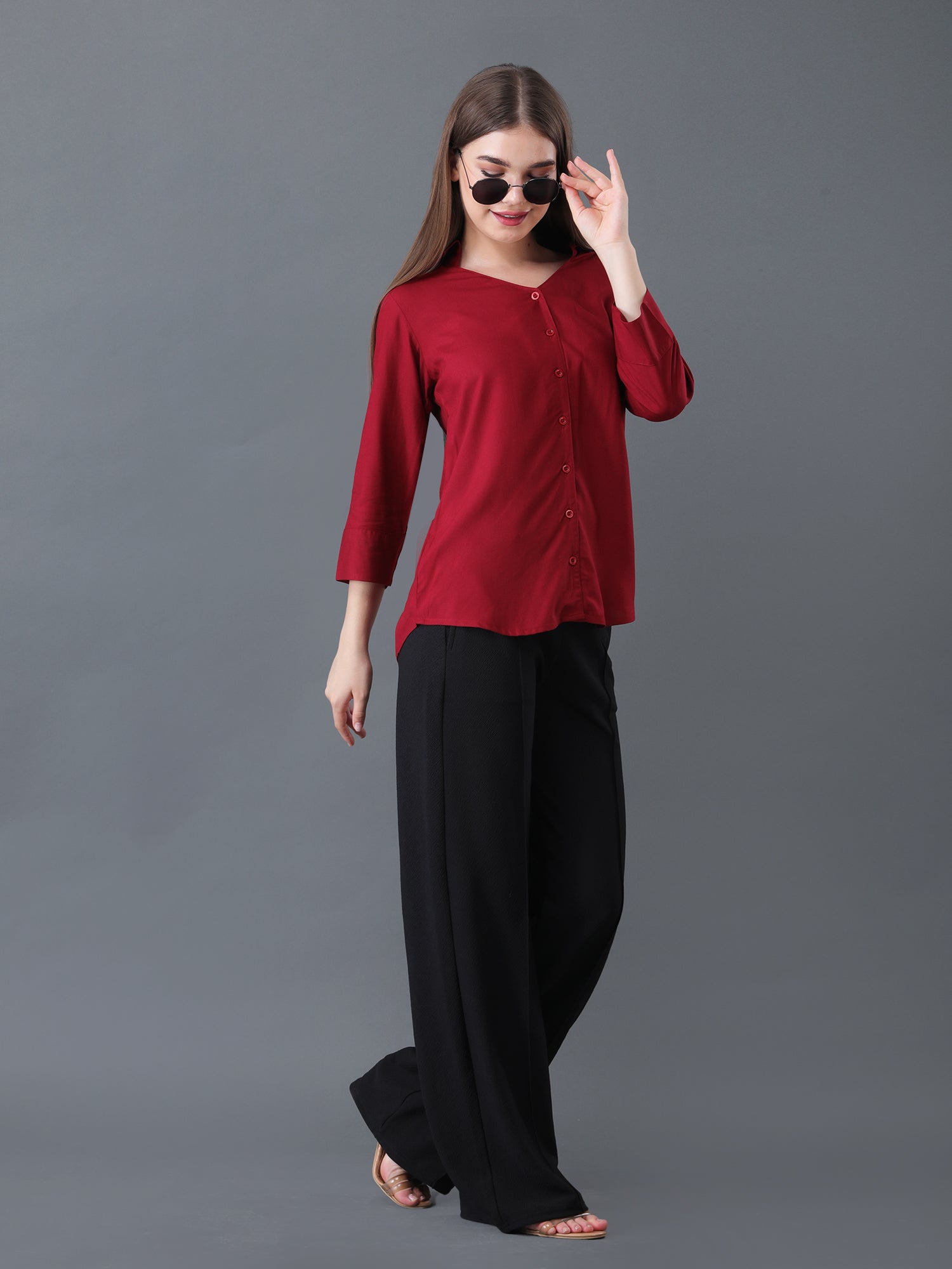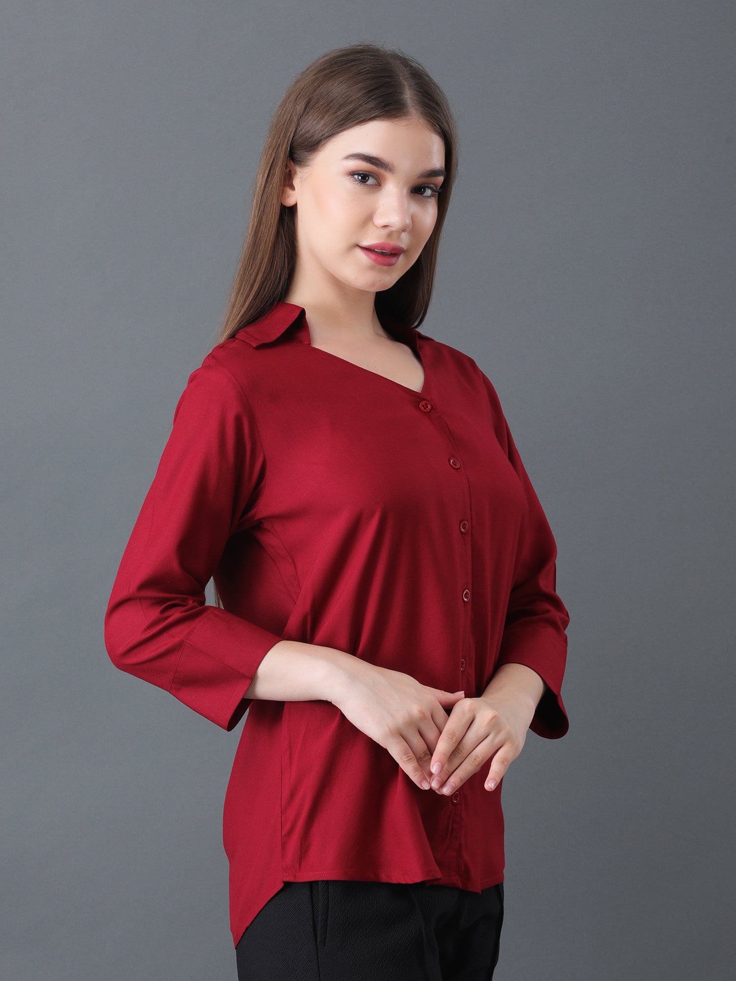 Refresh office and casual looks with this classic maroon button down shirt for women, designed with smart 3/4 sleeves and a flattering V-neck collar. Made from lightweight, breathable fabric, this versatile shirt promises all-day comfort and effortless style. Perfect for pairing with trousers, skirts, or jeans, it includes a tailored fit that suits work, meetings, and everyday wear, making it a stylish addition to any wardrobe.