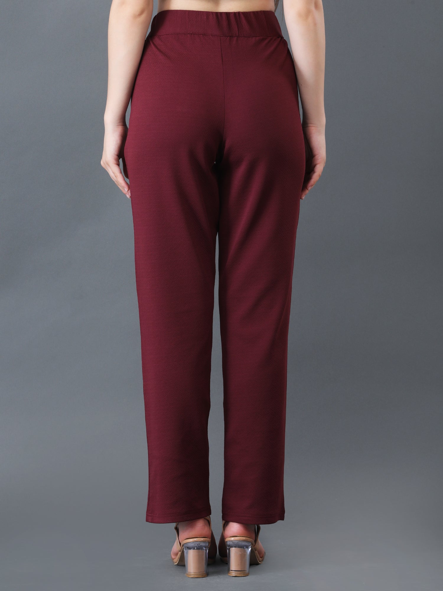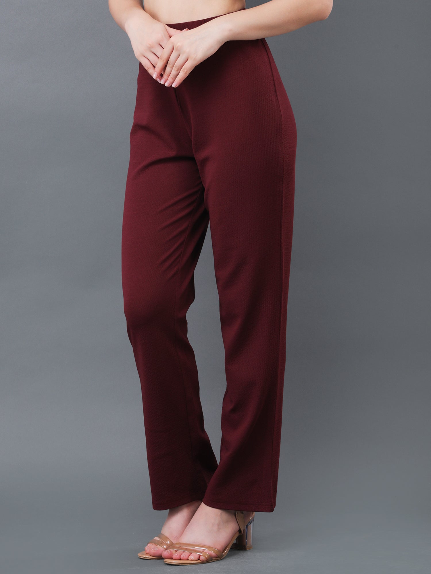 Elevate your style with these women's maroon straight fit lower, designed with a flattering high waist and tailored silhouette for all-day comfort. Crafted from soft, stretchable fabric, these versatile trousers are perfect for office, travel, or casual outings. Pair them easily with tops, shirts, or kurtis to create elegant looks for every season and occasion