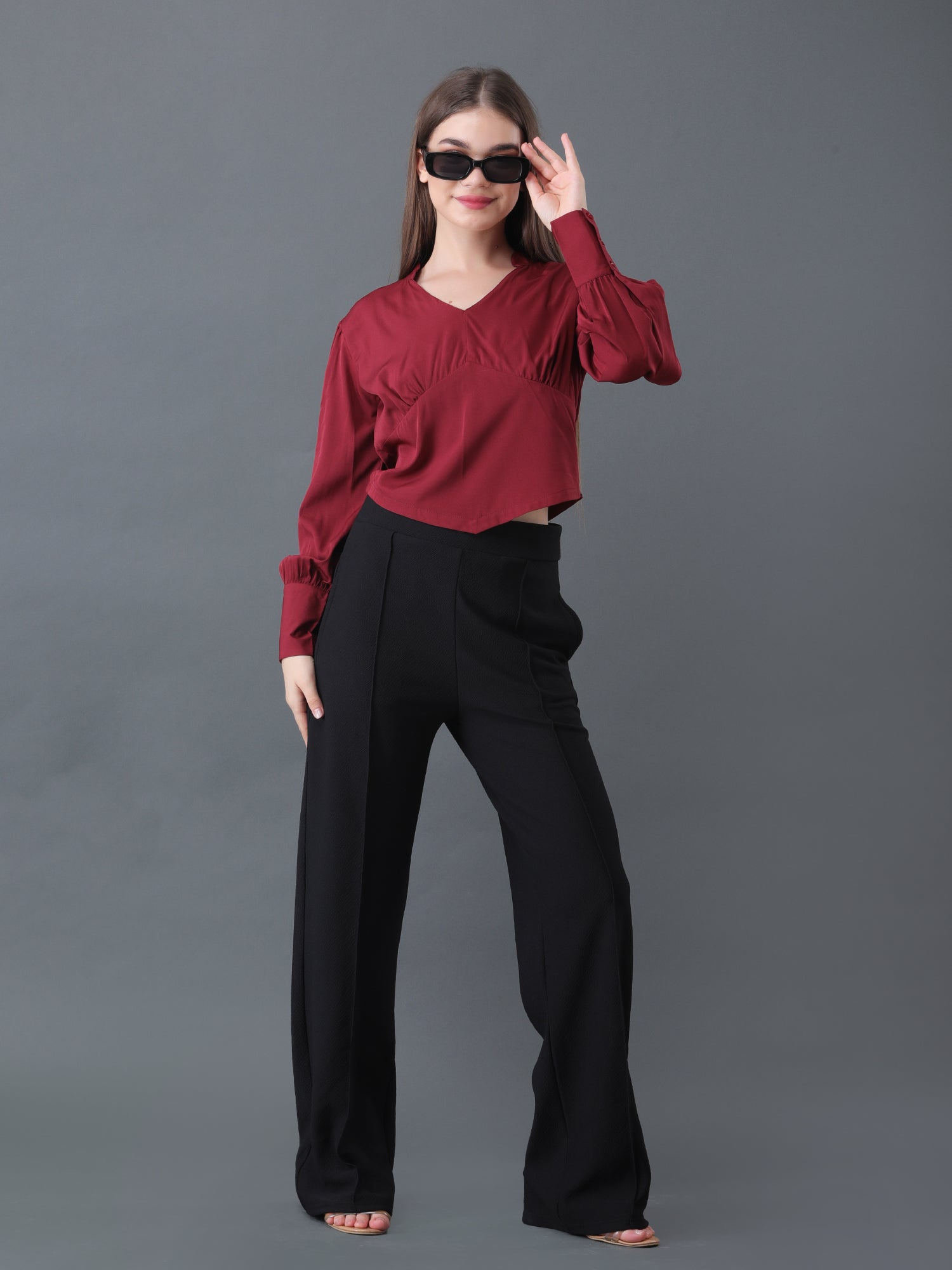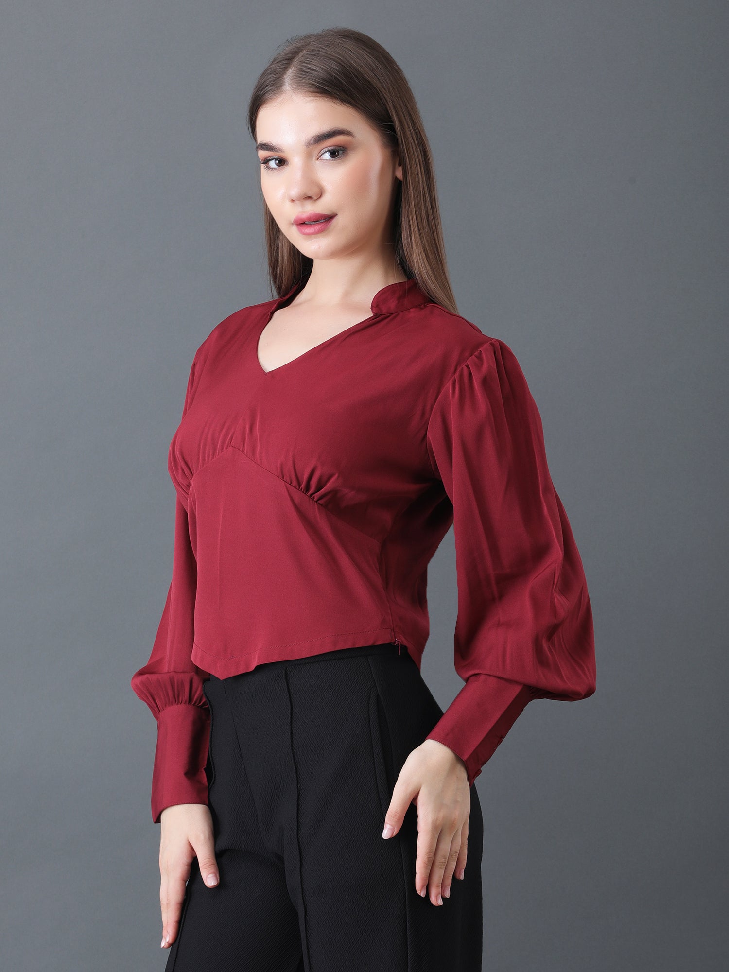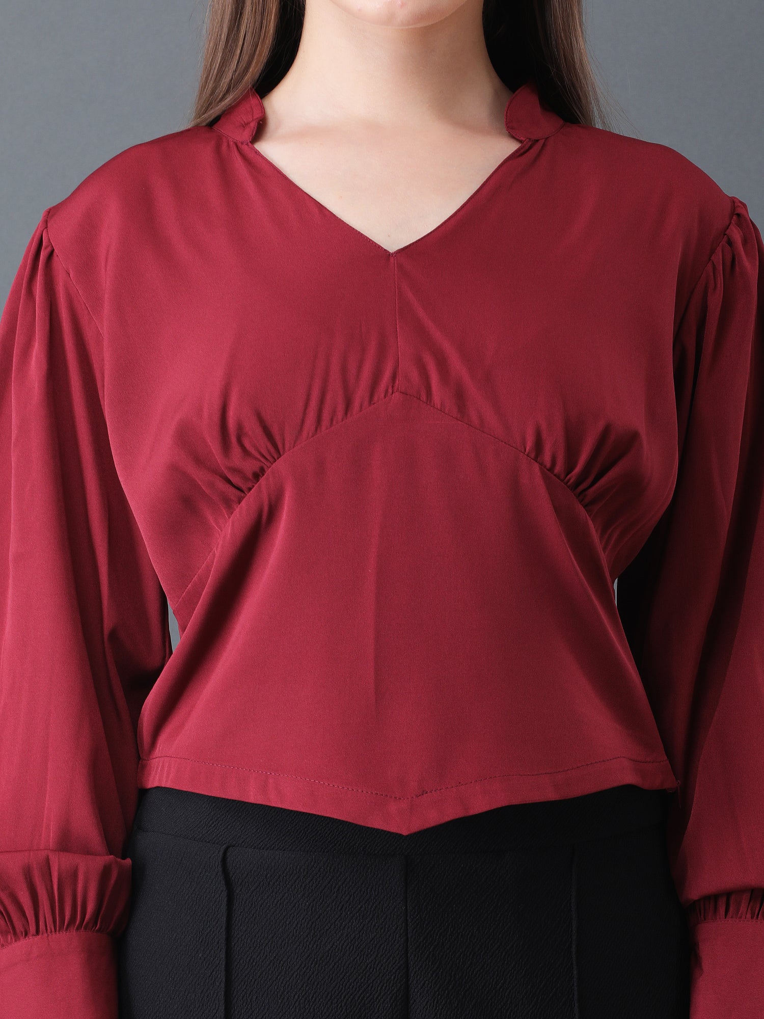 Redefine elegance with this women's maroon crop top, featuring a flattering V-neckline and stylish long sleeves with cuffed ends. The tailored front and contemporary cut create a chic, feminine silhouette perfect for pairing with high-waisted pants, jeans, or skirts. Made from soft, breathable fabric, this top is ideal for parties, dinner dates, or smart-casual events, offering comfort and fashion-forward appeal in every season