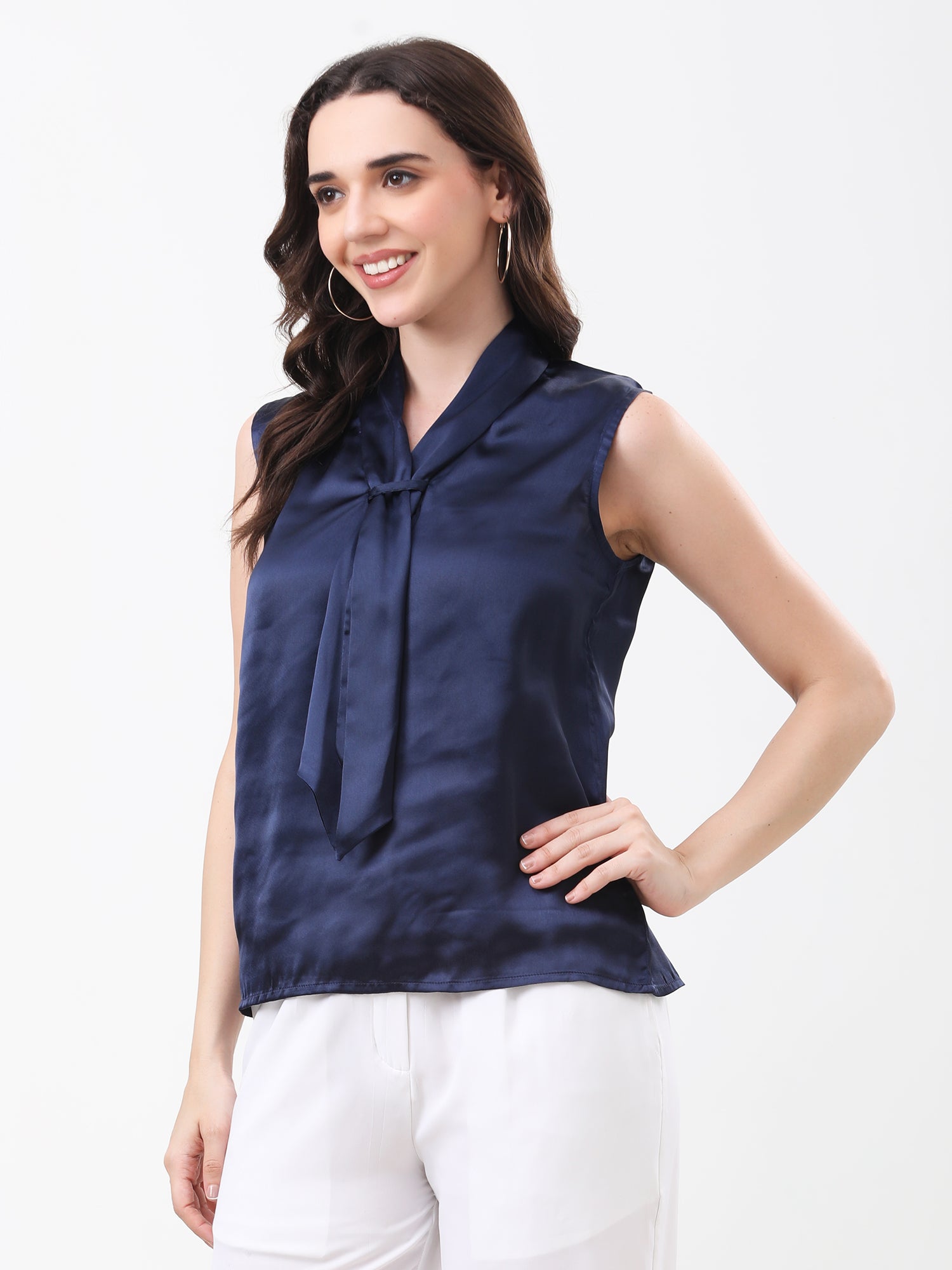 Add a sophisticated touch to your wardrobe with this Navy Blue front knot top, designed with a stylish tie neck detail for a chic and polished look. Crafted from smooth, lustrous Crepe fabric, this elegant top offers lightweight comfort, making it perfect for both office and evening wear. Pair effortlessly with trousers, skirts, or jeans for versatile styling throughout every season