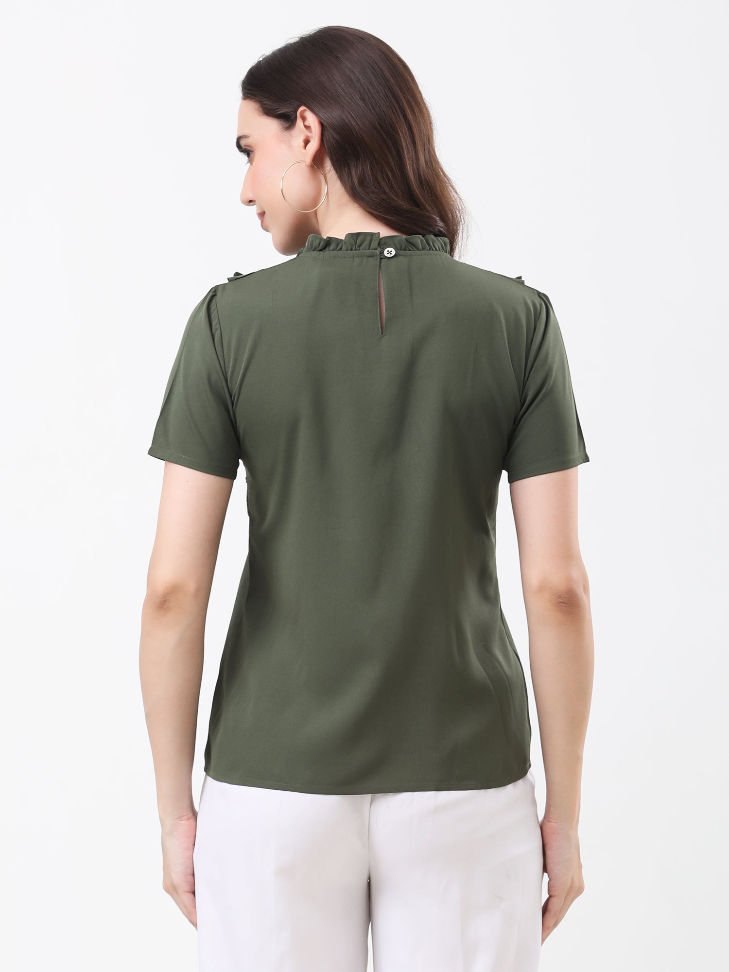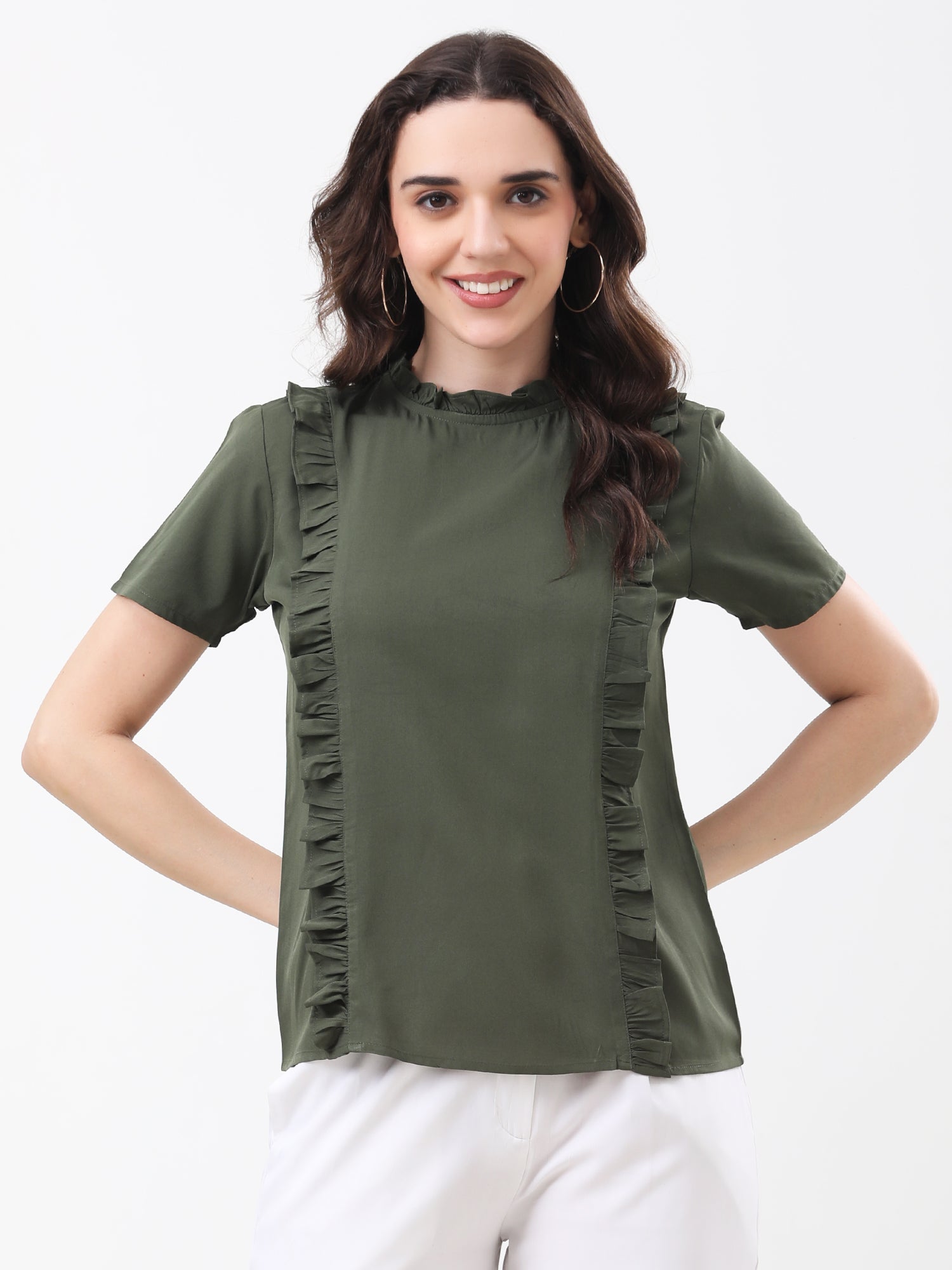 Refresh your wardrobe with this stylish olive green short sleeve top, featuring elegant ruffle detailing along the front for a playful and feminine touch. Crafted from soft, lightweight fabric, this chic blouse pairs effortlessly with trousers, skirts, or jeans—making it perfect for both work and casual outings. The classic round neckline and modern silhouette offer versatile styling for every season