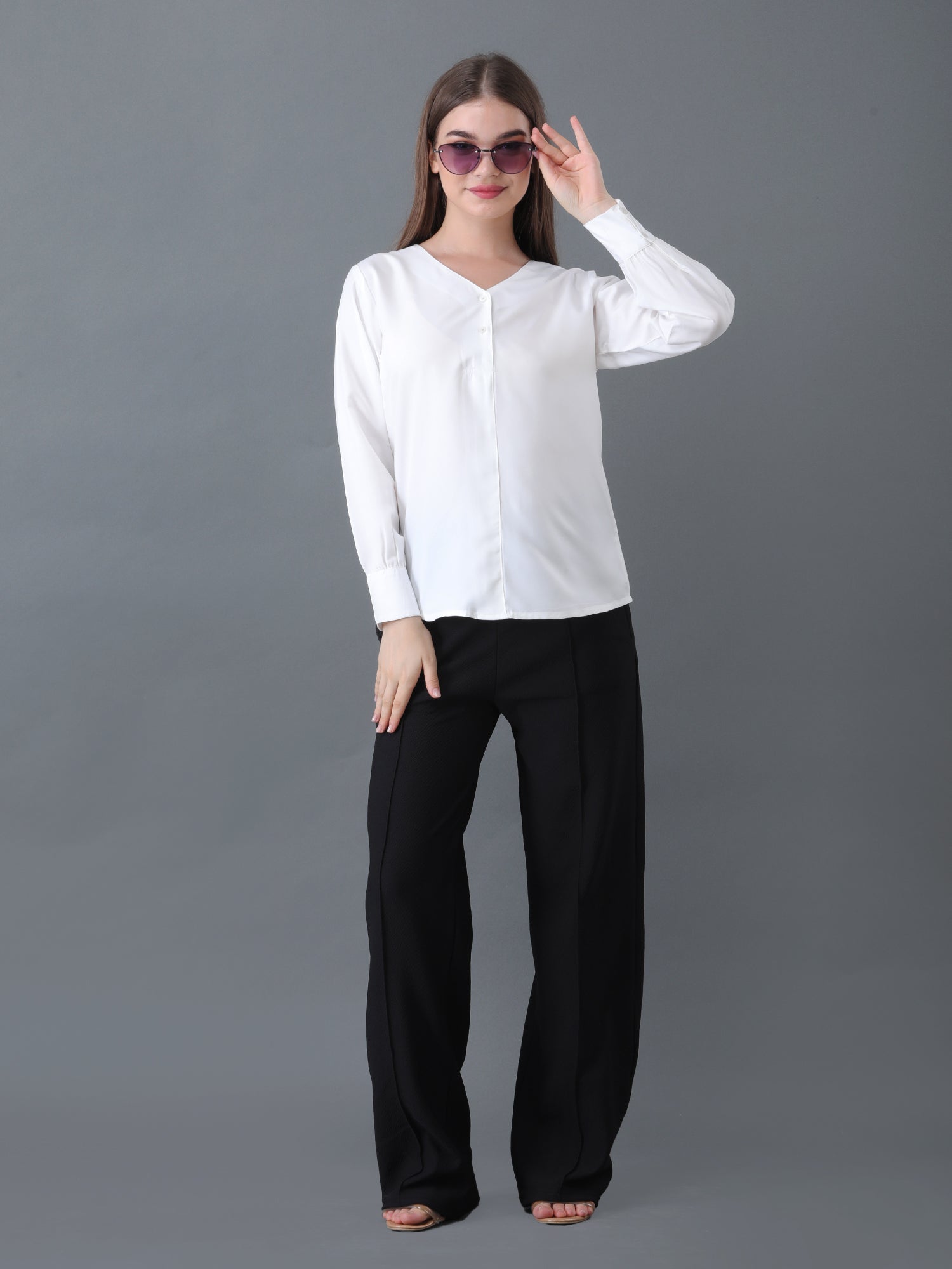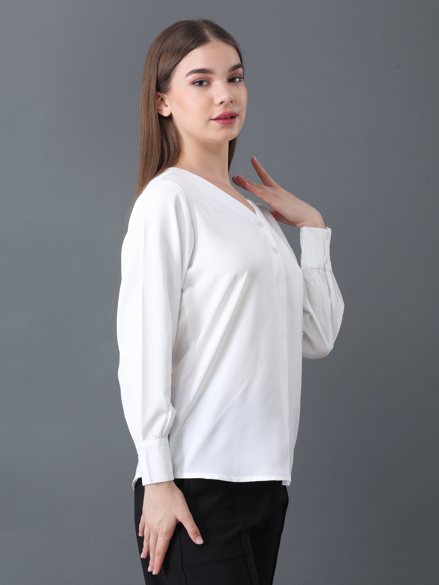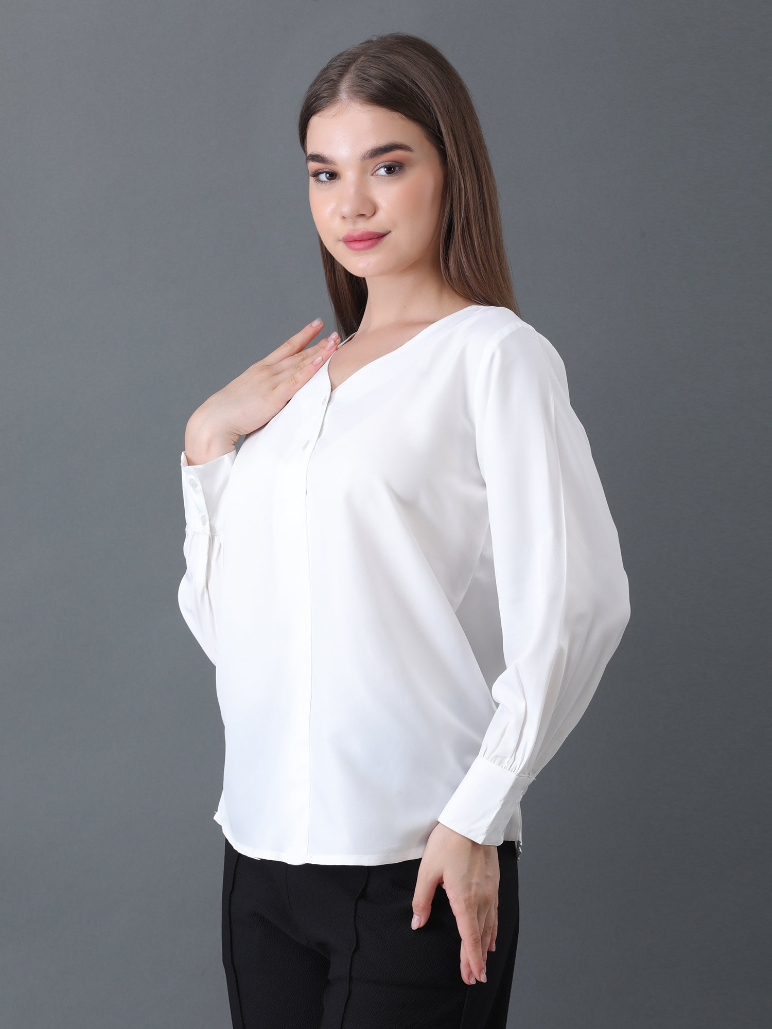 Enhance any wardrobe with this women's white V-neck long sleeve shirt, expertly crafted from soft, breathable fabric for lasting comfort. The clean lines, tailored sleeves, and button front design deliver a polished look suitable for work, meetings, or casual gatherings. Pair it effortlessly with trousers, skirts, or denim to achieve a chic and versatile outfit for every season.